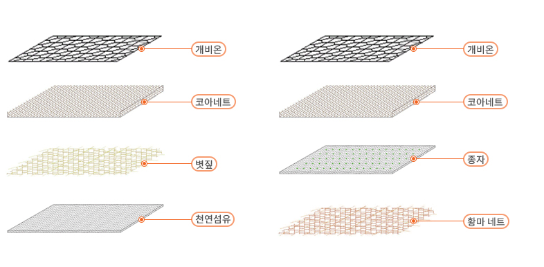 천연섬유, 볏짚, 코아네트 등의 매트 뿐 아니라 고정부재로 대나무를 이용한 천연재료를 사용하였습니다. 이러한 천연재료는 보습력이 우수하고 식물이 자라나는 거름 역할을 한 뒤 일정기간(2~3년)이 지나면 자연으로 돌아가는 친환경재료입니다.